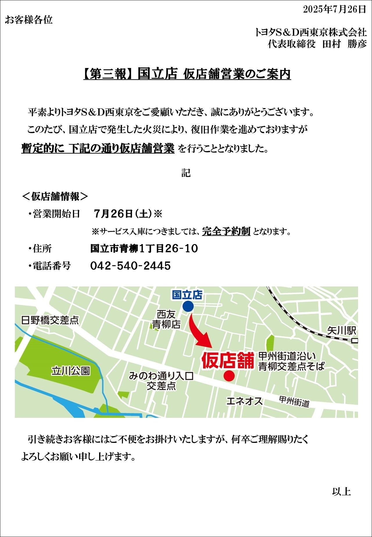 国立店 火災発生のお詫びと仮店舗営業のお知らせ