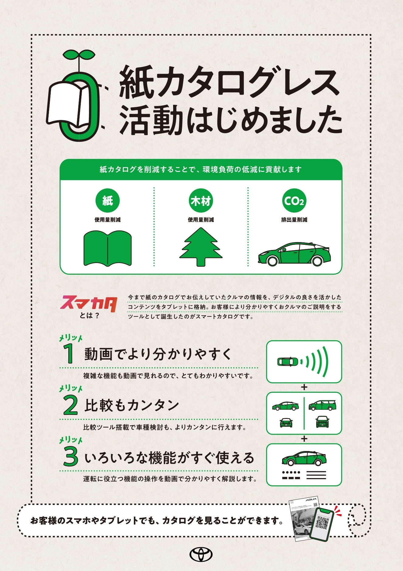 この度、トヨタS&D西東京ではSDGsの取組み一環として、2024年10月15日をもちまして紙のカタログ請求の受付を終了いたしました。
