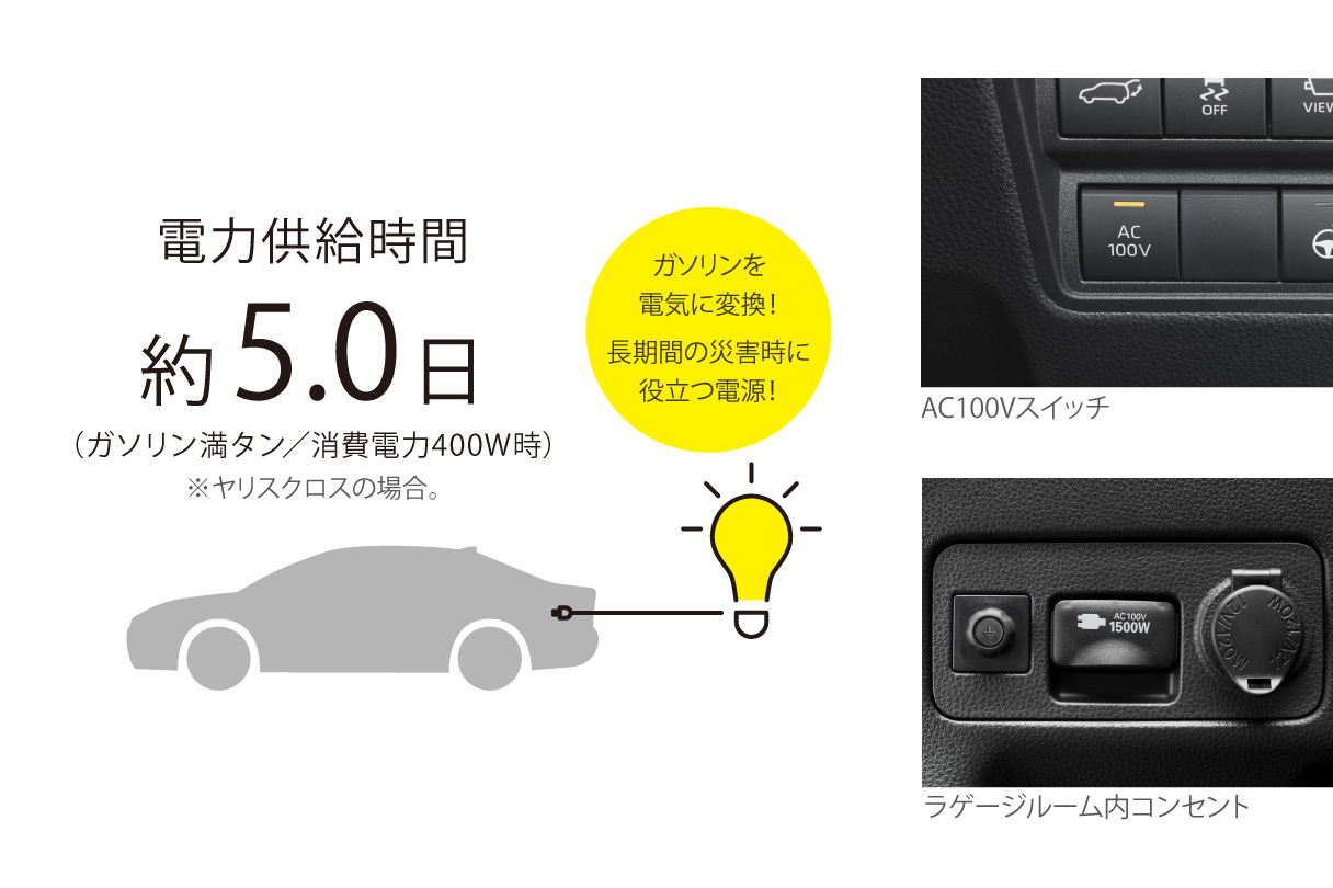 コンセント(AC100V・1500W)をラゲージルームに設置。非常時給電システムを使用することで、災害などによる非常時に電力が必要なとき、車両の走行機能を停止した状態で、燃料残量警告灯が点灯するまで、AC100Vで消費電力の合計が1500W以下の電気製品を使用できます。